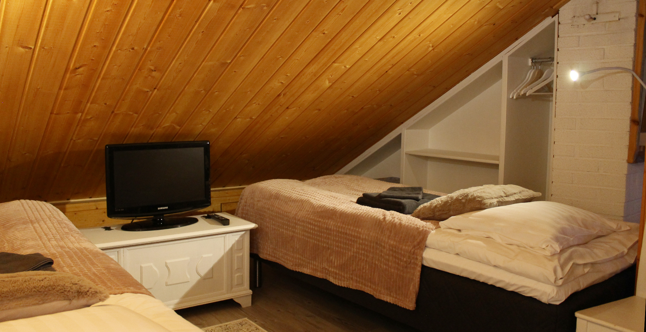 Yläkertaan johtavat kunnolliset portaat, ja avoparvelta löytyy kaksi 80 cm sänkyä (mahdollista siirtää vierekkäin) sekä