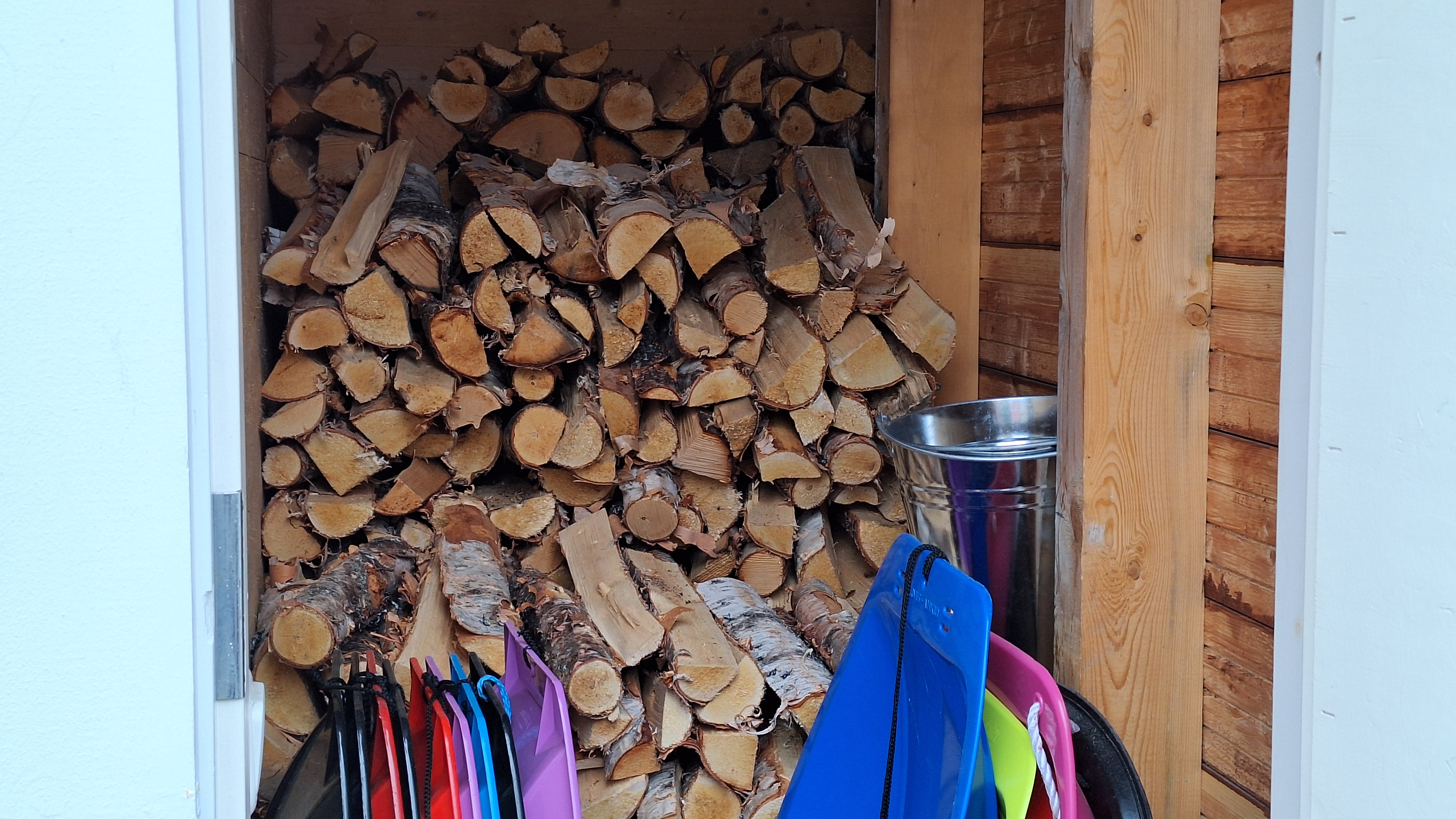Pienessä ulkovarastossa on polttopuita, ja siellä voi säilyttää suksia. Suksien voiteluun on erillinen huone pihapiirissä sijaitsevassa huoltorakennuksessa, jossa pidät ulkoiluvälineet – niin sukset kuin pyörätkin – hyvässä kunnossa.